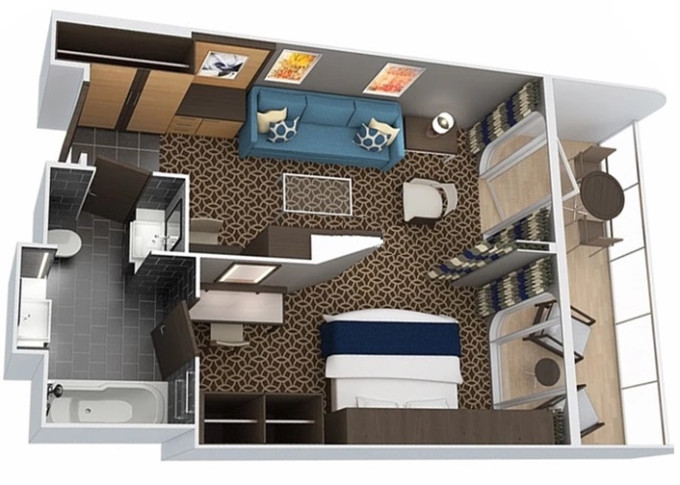 | 1U - Vnútorná kajuta s virtuálnym balkónom 15,5 m². Obrazovka veľkosti balkónových dverí s premietaným výhľadom. Centrálne umiestnenie. Max 3-4 osoby. | 1 728 € 576 € za osobu | ||